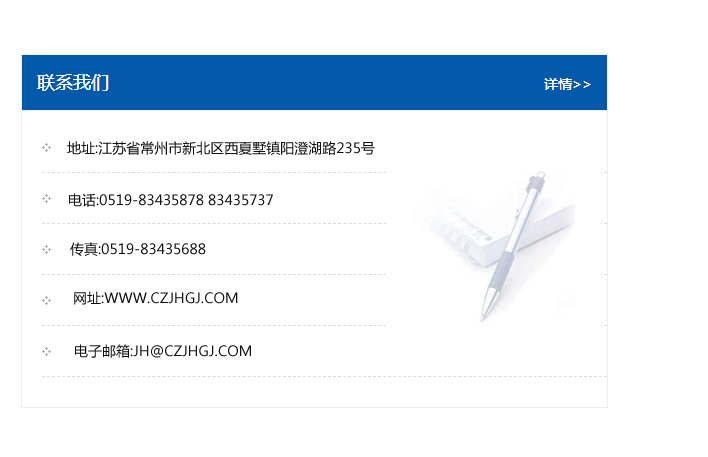 地址:常州市新北區友邦商務大廈1幢16、17層  電話:0519-85101652  傳真:0519-85112595  郵編:213022  網址:www.cz-jiayue_cn.0412dz.com  郵箱:xiajifengaa@163.com